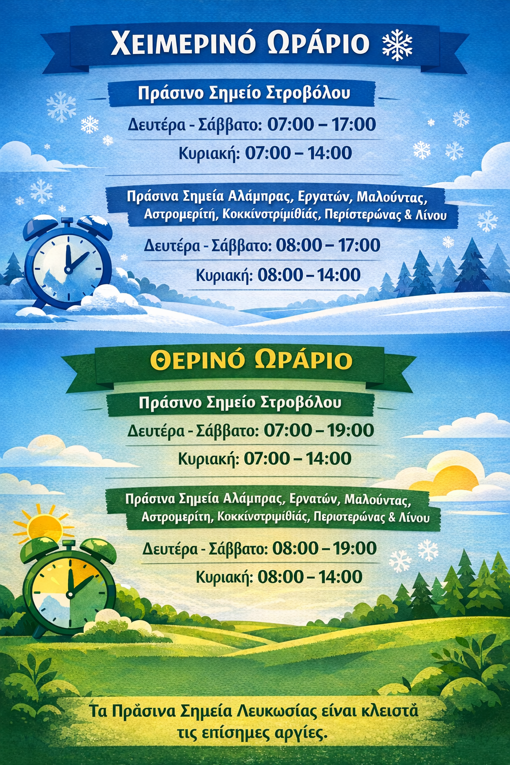 Για καλύτερη εξυπηρέτηση του κοινού τα ωράρια των Πράσινων Σημείων αλλάζουν από την 02 Ιανουαρίου 2026 ως εξής: